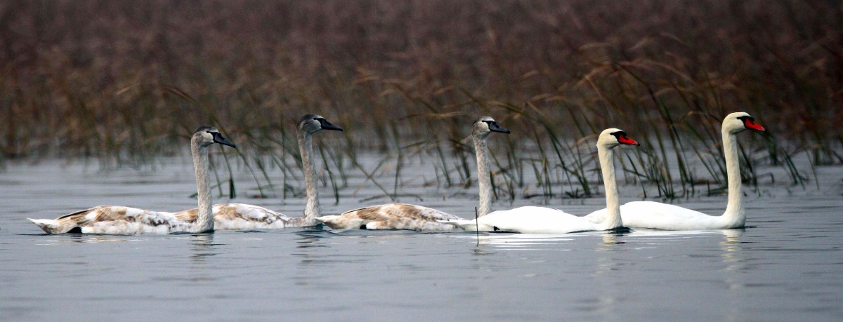 天鹅种群一般都是以家庭为单位迁徙。根据经验,工作人员推断,这两只成年天鹅是在寻找它们的孩子。几个小时后,在十二渡附近,工作人员再次看到了这两只天鹅,它们的身后跟着3只羽色稚嫩的天鹅宝宝,一家人终得团圆。
