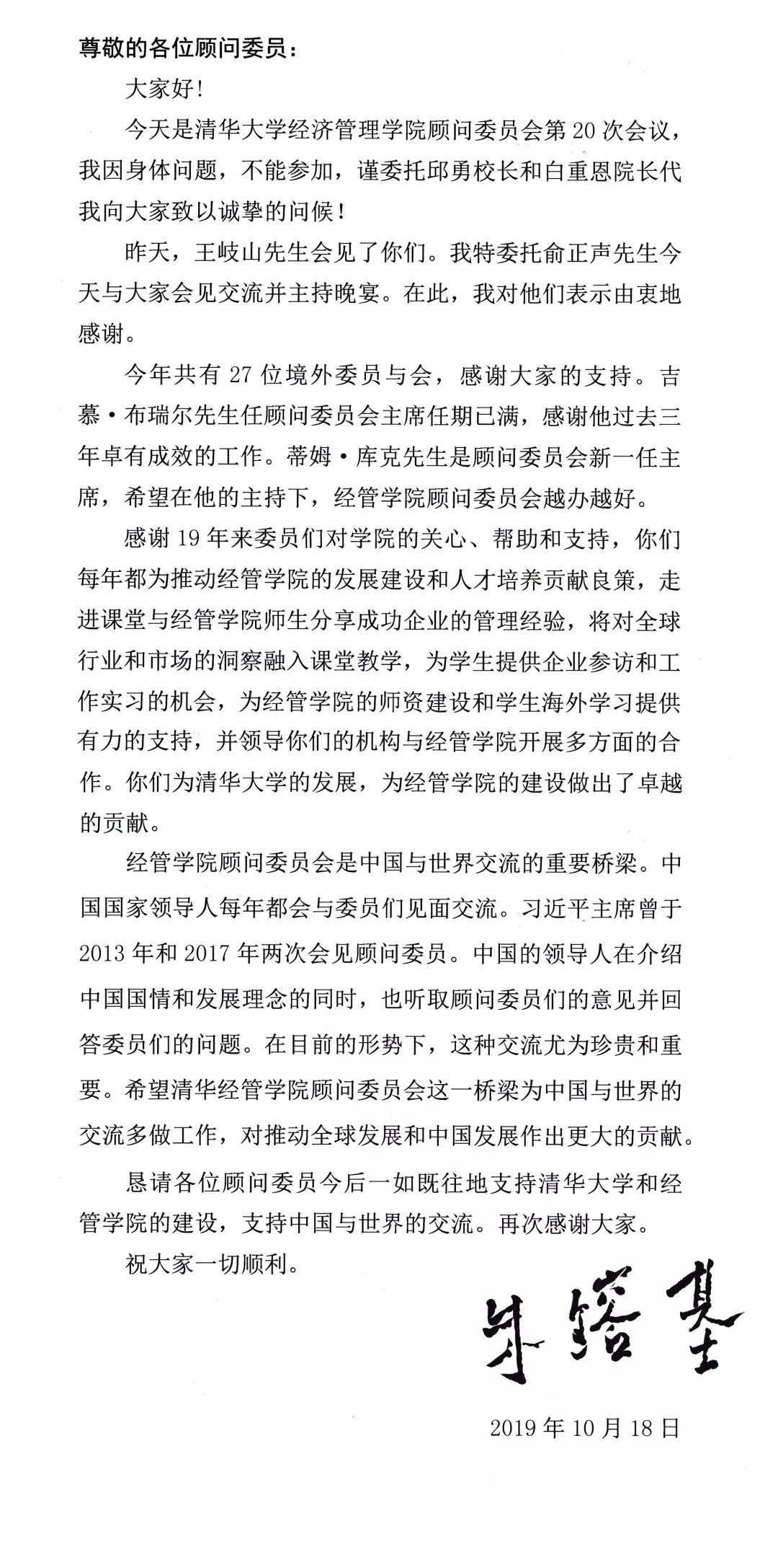 2019年10月18日,清华经管学院顾问委员会2019年会议举行,这是该委员会成立以来的第20次年度会议,共有35位委员参加会议及相关活动。会议当天,清华经管学院首任院长、顾问委员会名誉主席朱镕基发来信函,向顾问委员会委员表示问候,并对大家的支持表示感谢。朱镕基在信中表示,清华经管学院顾问委员会是中国与世界交流的重要桥梁,希望这一桥梁能够为中国与世界的交流多做工作,为推动全球发展和中国发展作出更大的贡献。