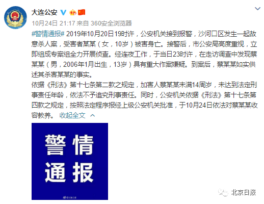 10月24日21时许,@大连公安 发布警情通报称,加害人蔡某某(男,2006年1月出生,13岁)如实供述其杀害某某(女,10岁)的事实,但因蔡某某未满14周岁,未达到法定刑事责任年龄,依法不予追究刑事责任。10月24日,蔡某某被公安机关依法收容教养。