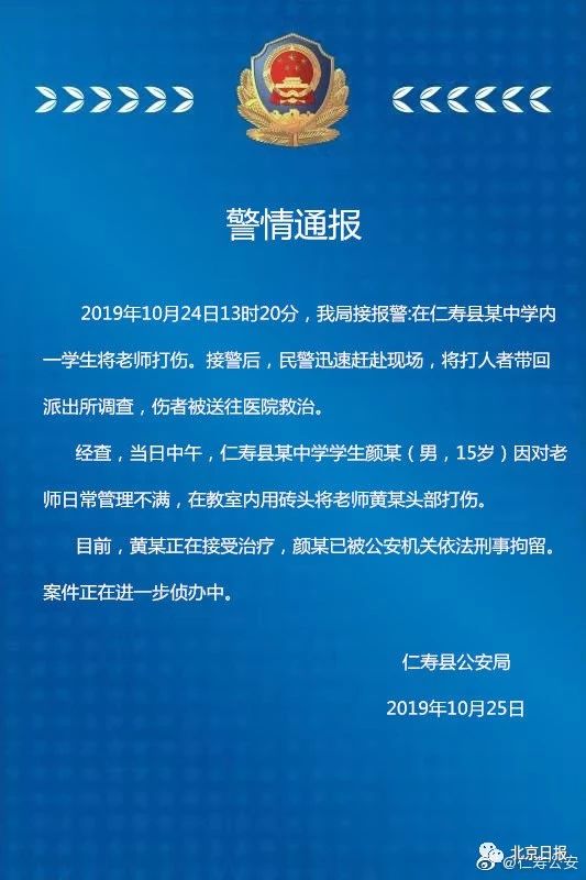 2019年10月24日13时20分,我局接报警:在仁寿县某中学内一学生将老师打伤。接警后,民警迅速赶赴现场,将打人者带回派出所调查,伤者被送往医院救治。