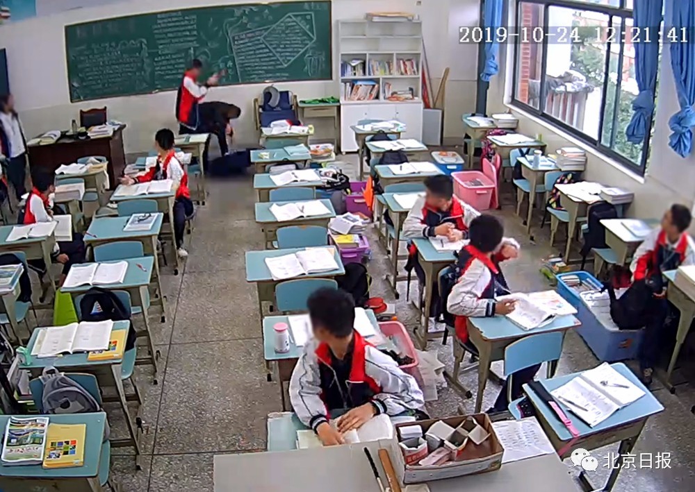 据澎湃新闻报道,近日一段网传时长1分47秒监控视频显示,10月24日12时21分左右,一名男性老师从后门进入教室,准备将手中的雨伞撑开放在地上,另有一名男生紧随其后,男生双手紧握疑似砖头物件,从背后击打男性老师头部9次,致该名老师倒地不起。