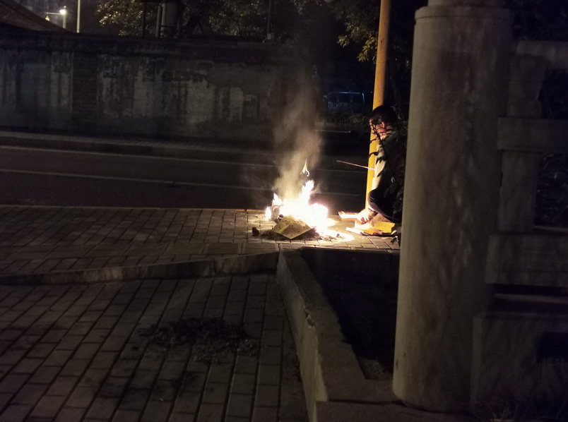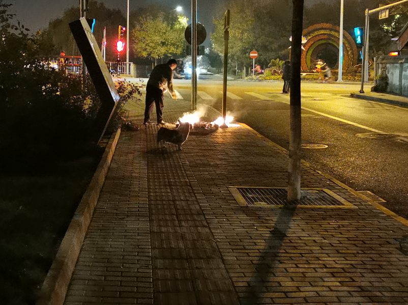 “今天人还算是少的,昨天晚上烧纸的人更多。”住在附近的金先生说,前天夜里刮大风,焚烧祭品的人却很多,十多个人同时在路上烧祭品,“我们都怕一阵大风吹来把火星吹到路边的绿化带里,引发火灾。”