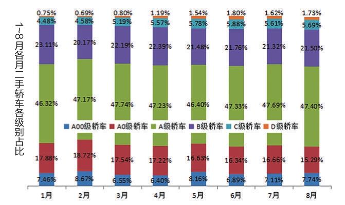 1-8月,全国二手车累计交易量为927.3万辆,同比增长3.89%。从1~8月各级别轿车的整体销量来看,A级轿车仍旧是二手车市场中最热销的车型,平均占比为47.2%;其次是B级轿车,平均占比21.7%;C级和D级轿车价格相对较高,所以在二手车交易市场中销量最低。