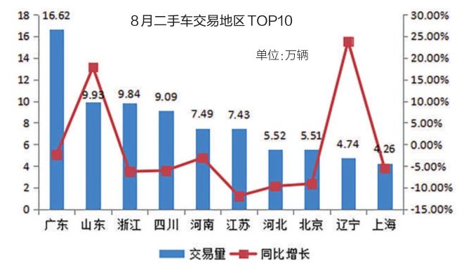 8月,各地区二手车交易量有很大差异,排名前十的地区占总交易量的67.1%。其中,广东省交易量最大,为16.62万辆;山东、浙江、四川分列二至四位,交易量均在9万-10万辆之间。从交易量排名前十的地区看,只有山东和辽宁同比实现增长,且增速较高,均达到两位数,分别为17.85%和23.85%,其他地区都有不同程度的下滑。