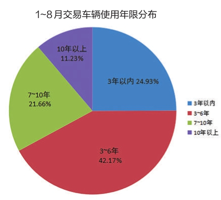 1-8月,使用年限在3~6年的二手车交易量最大,占42.17%;其次是年限在3年内的车辆,占24.93%;7-10年车龄的占21.66%;10年以上的占11.23%。值得一提的是,使用年限在3年内的车辆占比是自2010年以来最高的,老旧车(10年以上车龄)所占比重也是近9年最高的。两头比例在提升,中间比例在压缩,可见整个二手车市场周转频率在加快,这也说明老旧车找到了出路,量在扩大。