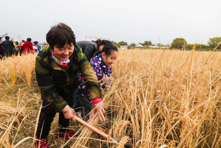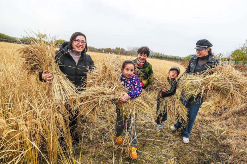 紧接着,孩子们在父母的帮助下,抱着一捆捆丰收的成果,又兴致勃勃地给稻穗脱粒、用稻草打草帘…脸上洋溢着幸福。“上次我带孩子一起来插秧,还摸了四条鲫鱼回家,她特别高兴。这次又特意来收割水稻,能让孩子了解夏种秋收,体会我们的农耕文化。”市民王女士说。
