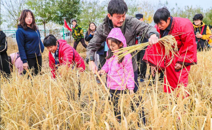 沉甸甸的稻穗弯了腰,秋风吹过,金灿灿的稻浪翻滚。今天,顺义北小营镇前鲁村第三届水稻收割节,在这片200亩稻田里开镰。不少市民闻讯而来,带着孩子弯腰收割、捡拾稻穗、稻谷脱粒……感受丰收的喜悦。