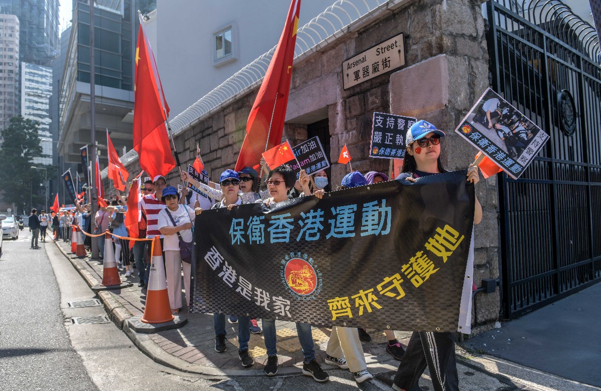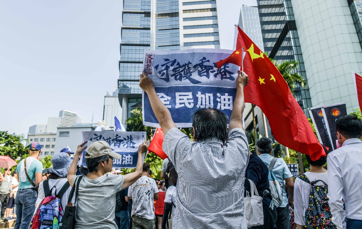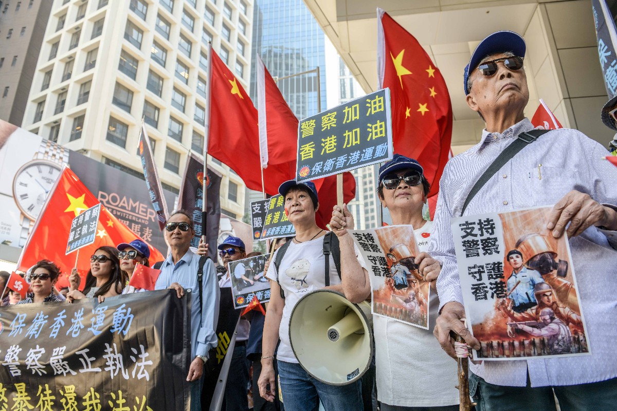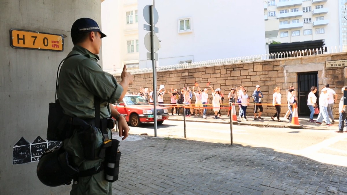 “支持警察,严正执法!”千余名市民的呼喊响彻警察总部上空。