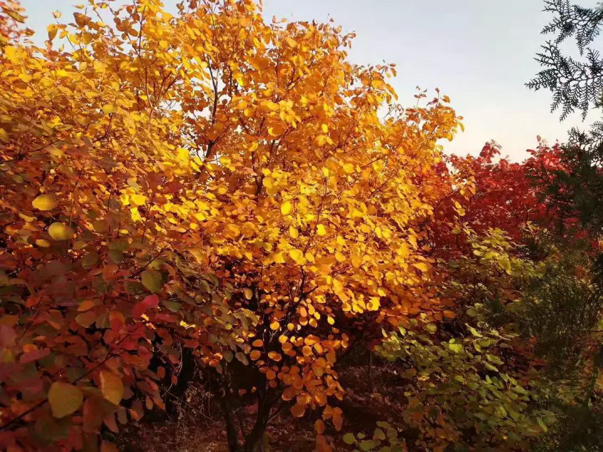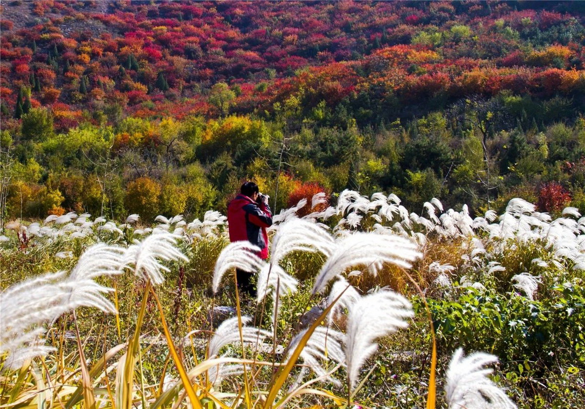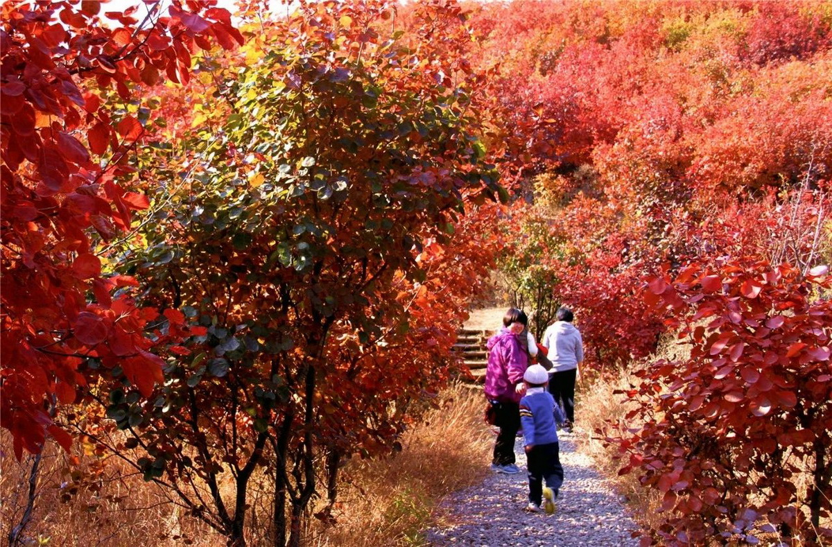 山间,遍布数万亩各具特色的彩叶林。深秋时节,火炬、黄栌、元宝枫、银杏、白蜡等树木50余种观赏树,色彩相互交织,勾勒出一幅幅五彩缤纷的画卷,在起伏连绵的山坡上徐徐展开。