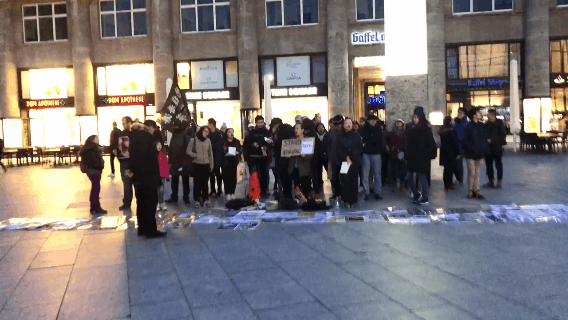 视频显示,约二三十个香港青年举着“光复香港 时代革命”的黑旗和写满标语的牌子,在德国街头聚集,喊口号示威,表达诉求。