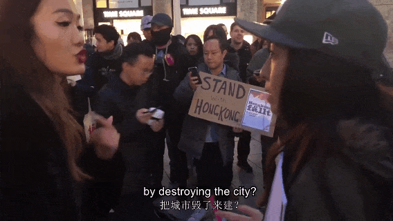 当示威者表示“‘光复香港 时代革命’的意思是建设一个新的香港”时,现场一名自称来自深圳的姑娘上前与他们理论:“怎么建?把城市毁了来建?在地铁里放火来建?割警察脖子来建?”