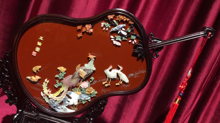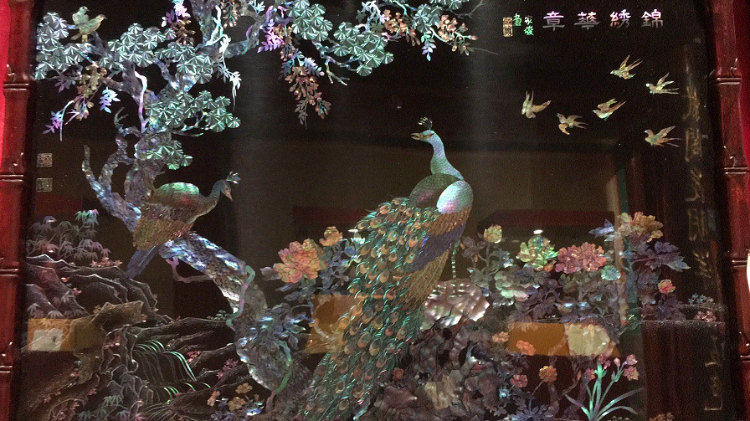 展厅里,每一件漆艺精品背后都有故事。一件雕漆九龙尊摆件采用了扬州漆器雕漆技艺,九条腾飞的龙活灵活现。由中国工艺美术大师池家骏设计的点螺锦绣华章台屏格外引人关注。屏风上,两支孔雀开屏,象征着美好和吉祥如意。所谓点螺工艺是扬州独有的工艺,匠人选用自然色彩的夜光螺、珍珠贝和石决明等材料精制成薄如蜂翼、小如针尖的“螺”片,再用特制的工具一点点地填在平整的漆胚上。
