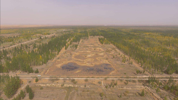 张先生还提到,污染场地紧临沙坡头自然保护区,其中一处倾倒点在离沙坡头国家自然保护区界碑以北500米处,但无法判断是否是在保护区内。据张先生拍摄的现场图片显示,树林中间有一处被黄色沙子覆盖的空地,用铁锹挖开,里面是黑色的油状物。