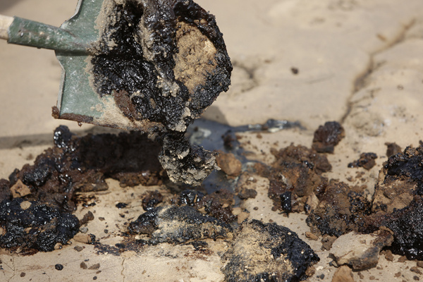 用铁锹挖开排污池,里面全是黑色的油状物