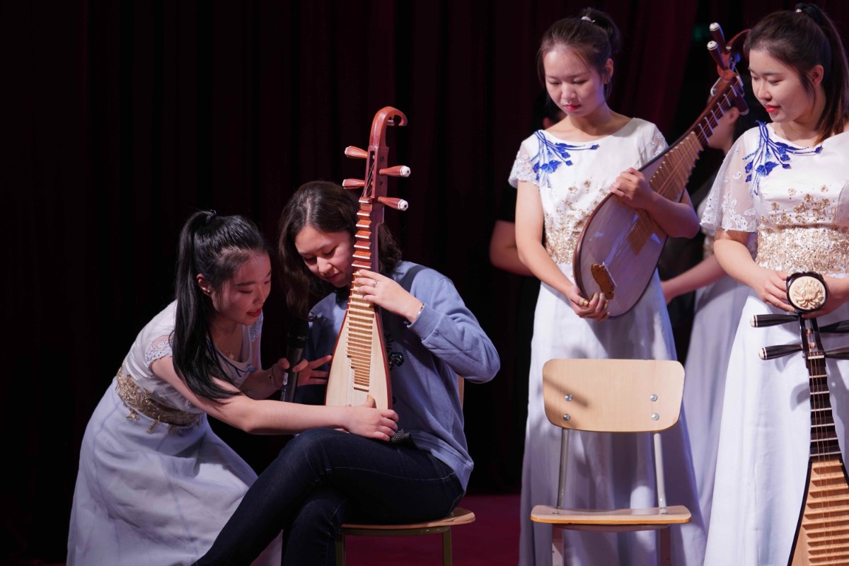 古筝与琵琶二重奏《春江花月夜》、三弦独奏《十八板》、琵琶三重奏《天山之春》、扬琴独奏《春到清江》……一个多小时里,一首首经典的民乐作品接连奏响。每首乐曲开始前,乐团带队老师马英俊都会简单讲解乐曲的背景和所用到的乐器,比如弹拨乐器因何而得名?《春江花月夜》又是怎样从《夕阳箫鼓》演变而来的?从始至终,台下听觉异常灵敏的学生们都是那样安静而专注。