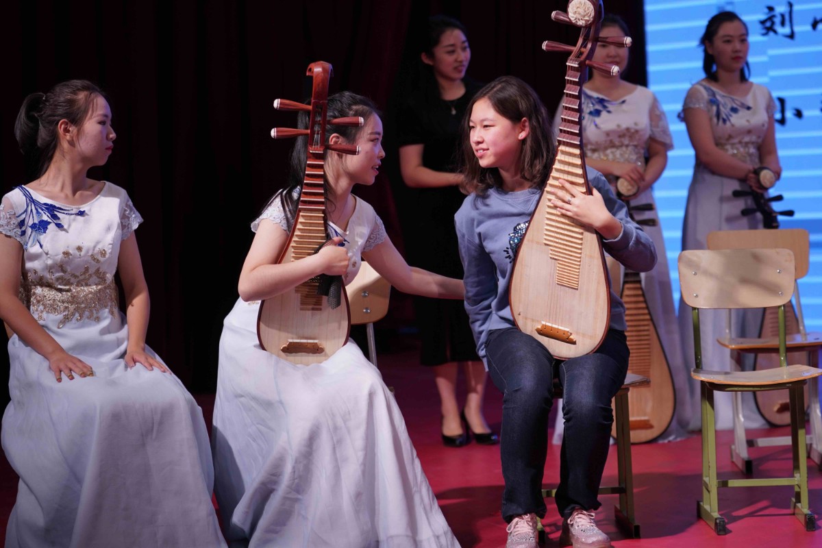 “弹小琵琶的时候,腿要翘起来,指法和琵琶是一样的。”就读于中央音乐学院的樊怡凝轻轻抓住张泽坤的手,抚摸了一遍小琵琶的琴弦。张泽坤调弦试弹,琴音流泻,极有西域风情,正是古诗中所写“大珠小珠落玉盘”的样子。