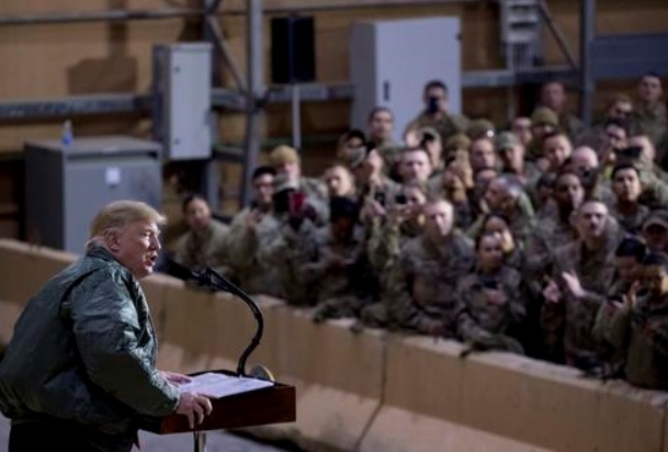 2018年12月,在伊拉克西部的阿萨德空军基地,美国总统特朗普对驻伊美军官兵发表讲话