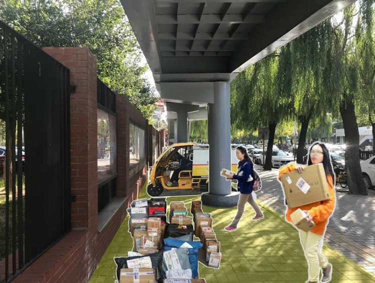 在报告最后,张祎迪制作了一张效果图,将天桥下方实景与人们来此取快递的场景进行了虚拟组合,勾勒出桥下热火朝天派送快递,一旁人行道仍可顺畅通行的理想画面。