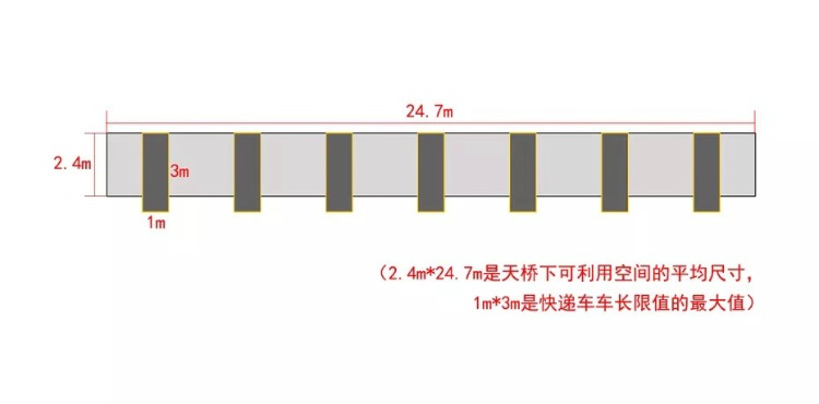 “其实他们的天桥就完全可以利用,实地探访时我发现从西门一出来就是人行天桥,校园与天桥距离为零。且天桥下方侧面是学校的围墙,不是商业店面,也不存在遮挡问题。”她同样对高于2米的桥下部分进行了测量,总共长度约30米,空间非常可观。“当然现在快递柜已经安在了校园内,如果未来有其他占道情况,例如共享单车停放等,其实也都可以考虑利用这些‘边角料’。”
