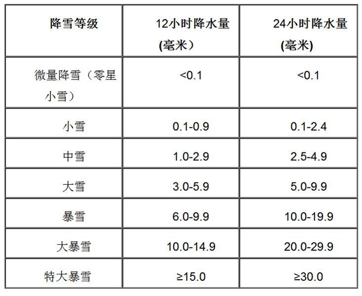 不同时段的降雪量等级划分