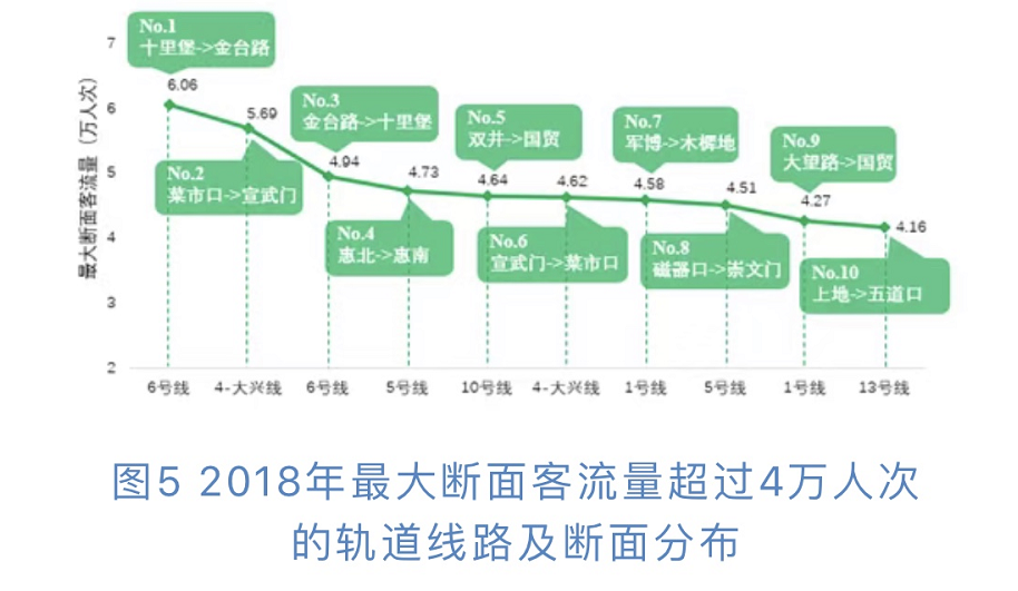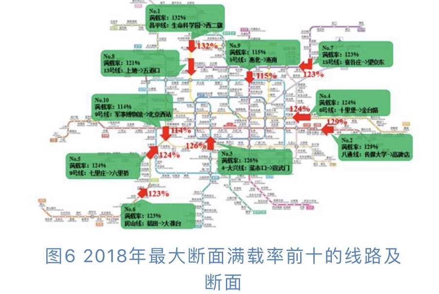 在满载率方面,2018年,北京市轨道交通线路中共有10个断面小时最大客流量超过了4万人次,按客流量排名依次是6号线十里堡开往金台路、4号线菜市口开往宣武门、6号线金台路开往十里堡、5号线惠新西街北口开往惠新西街南口、10号线双井开往国贸、4号线宣武门开往菜市口、1号线军事博物馆开往木樨地、5号线磁器口开往崇文门、1号线大望路开往国贸、13号线上地开往五道口。其中,6号线十里堡开往金台路断面早高峰小时最大断面客流量达到了6.06万人次。