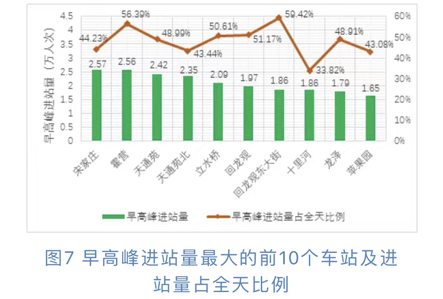 从进出站客流量上看,轨道交通早高峰进站量最大的前10个车站中,以北部地区回天居住区范围内的地铁站居多,包括霍营站、天通苑站、天通苑北站、回龙观站、回龙观东大街站、龙泽站等,早高峰进站量占其全天进站总量的48.01%。