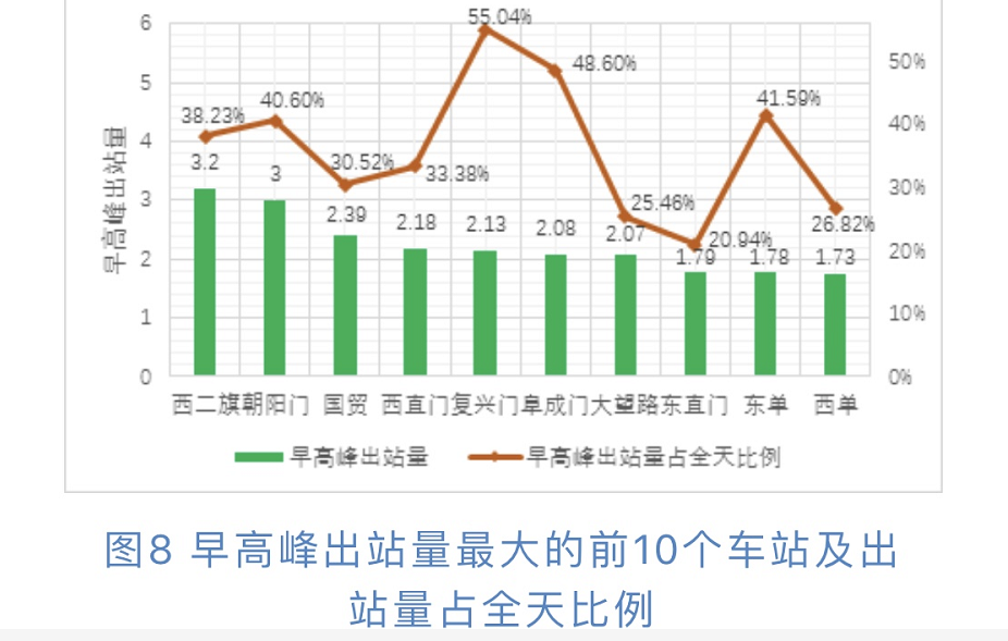 轨道交通早高峰出站量最大的前10个车站中,以金融街、国贸地区地铁站居多,包括国贸、大望路、复兴门、阜成门、西单等,早高峰出站量占其全天出站总量的36.12%。
