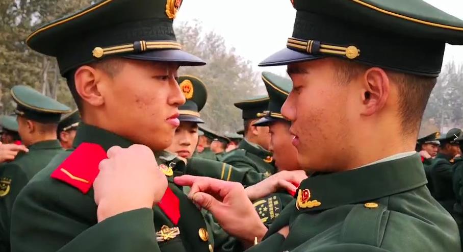 迎武警部队旗,奏唱军歌,宣读授衔命令。新兵们每两排面对面站立,相互佩戴肩章。“我是中国人民解放军军人,我宣誓!”场下新兵戴着崭新的红肩章,军容严整、士气高昂,向八一军旗庄严宣誓,铮铮誓言响彻会场。一张张略显稚嫩的脸庞上写满兴奋、激动,甚至还挂上了泪花。这一刻,所有的汗水与泪水“破茧成蝶”,铿锵的誓词展现他们矢志从军报国的决心和信心。