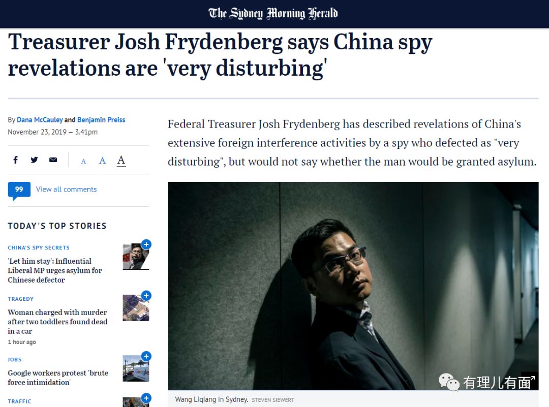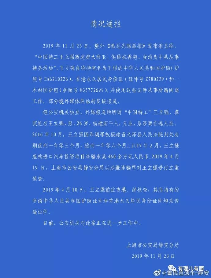 11月23日,澳大利亚《悉尼先驱晨报》报道了一则爆炸性新闻:“潜伏香港的中国特工王立强叛逃澳大利亚”!