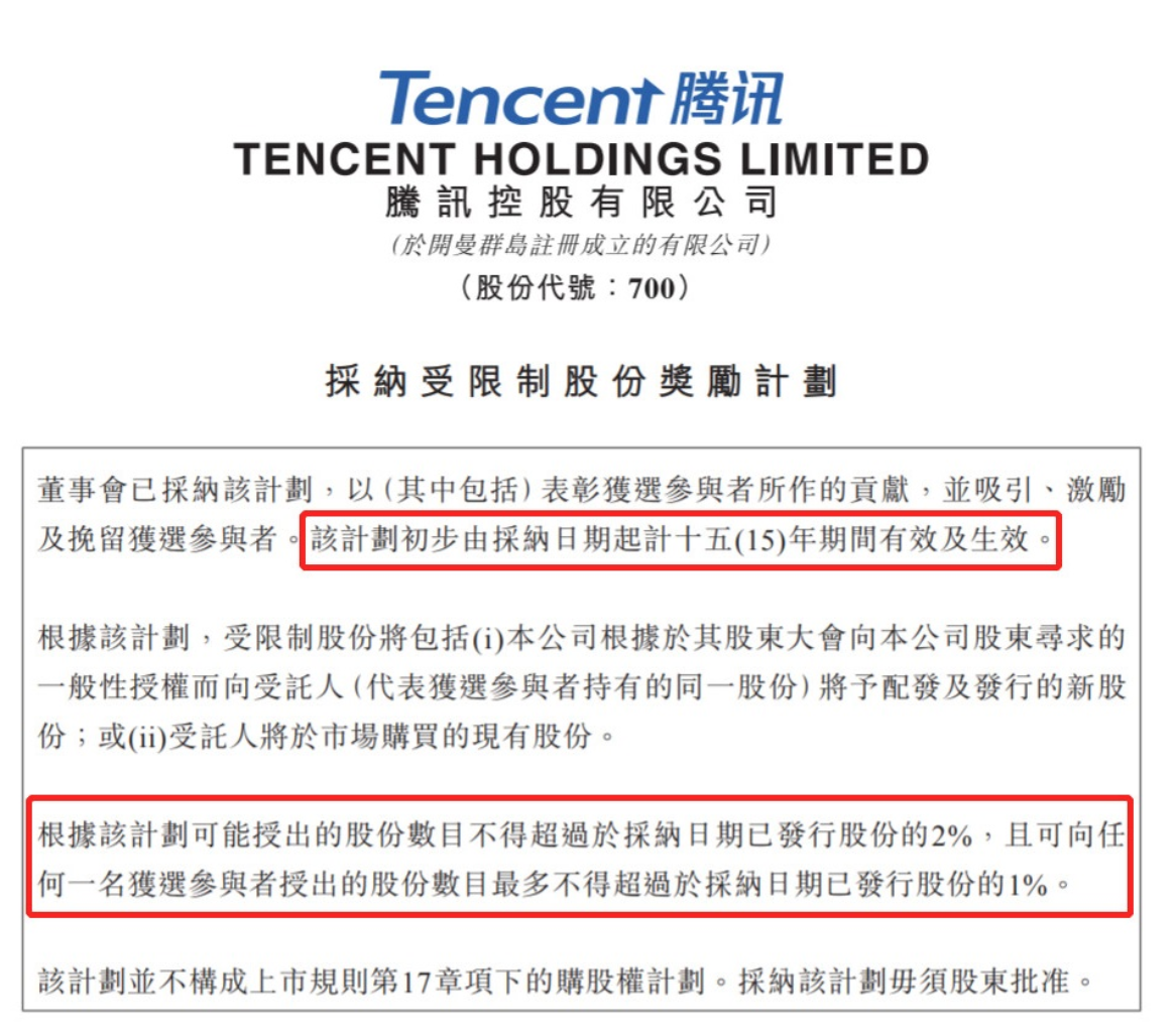 记者注意到,腾讯长期进行员工股权奖励的企业文化,最早从2007年开始。根据过往公告,腾讯曾在2007年和2013年分别提出过为期10年和15年的员工股权激励计划,奖励股份总数上限分别为当时已发行股份的2%和3%。