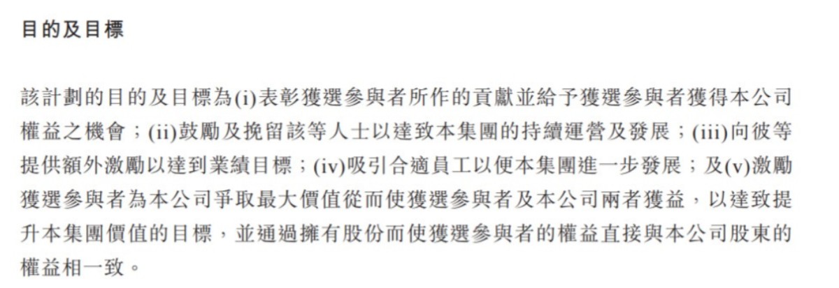 第五,激励获选参与者为本公司争取最大价值从而使获选参与者及本公司两者获益,以达致提升本集团价值的目标,并通过拥有股份而使获选参与者的权益直接与本公司股东的权益相一致。