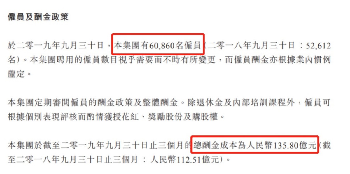 根据腾讯2019年三季报,截至9月30日,公司有6.09万名雇员,比一年前增加了8248名员工。而第三季度单季总酬金成本为135.80亿元,按照三季度期末员工数量简单折算,第三季度单季腾讯员工平均薪酬为22.31万元,平均月薪达7.44万元。今年第一季度,腾讯的平均月薪第一次突破了7万元,第二季度达7.27万元,第三季度腾讯员工薪酬继续提升。