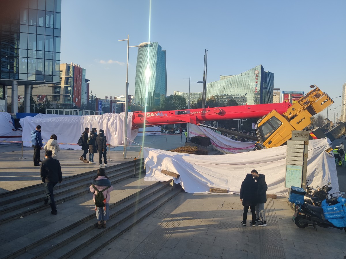 据目击称,吊车倒下后,一些共享单车被砸坏,黄庄地铁的一个地铁口也被倒地的吊臂从上方压过。