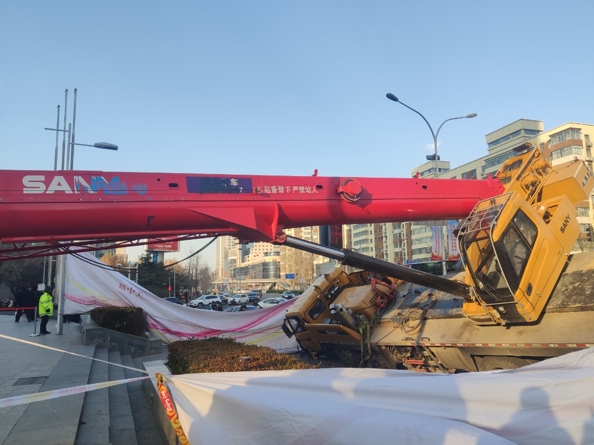 中午,记者赶到现场,看到倾倒的吊车倒在中关村大街辅路上,车身有一半是悬空状态,吊车的起重臂砸到新中关购物中心门前,距离商场的玻璃幕墙仅有一米左右。发生事故吊车已经被白色的塑料布围了起来,商场在外围也设置了警戒线,商场保安和交警正在周围维持秩序。由于吊车倾倒位置位于辅路上,交通并没有受到太大影响。