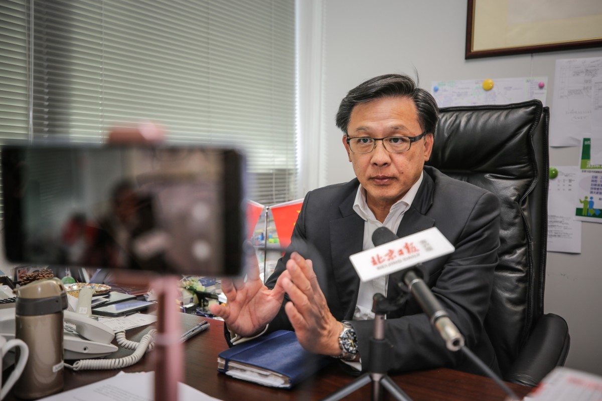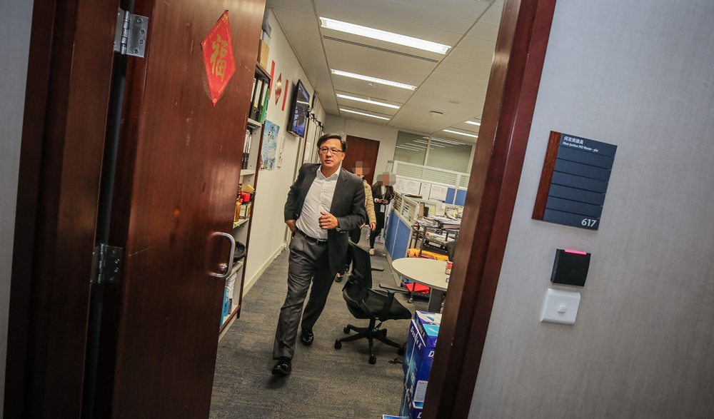 何君尧在办公室内接受采访。