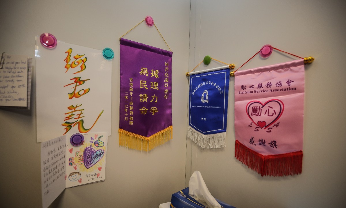 图为一些社会团体送来的锦旗和感谢信挂在何君尧的办公室内。