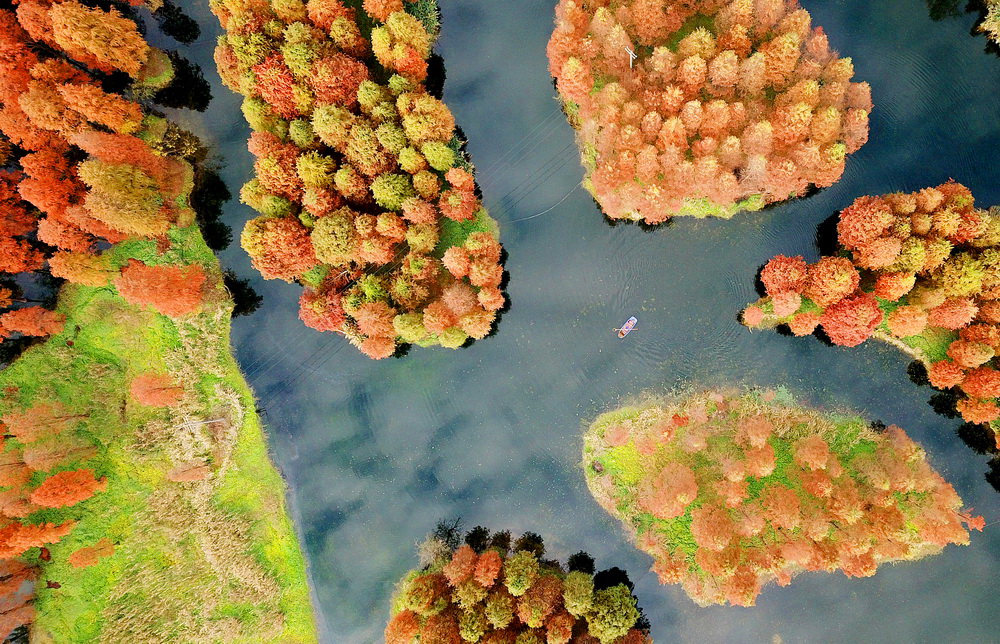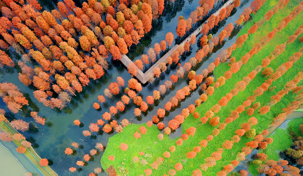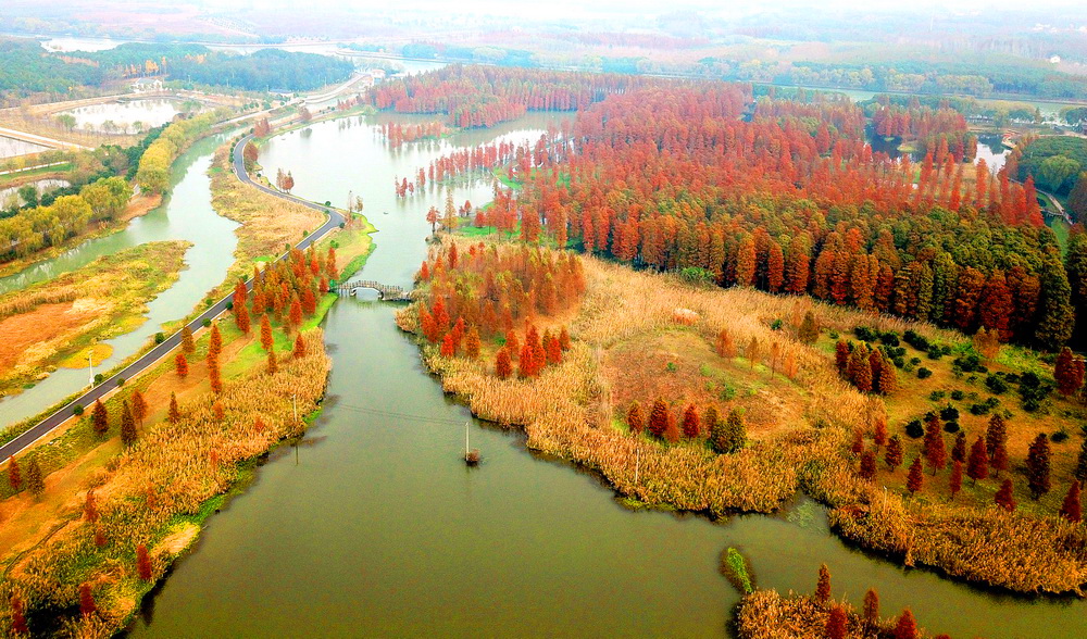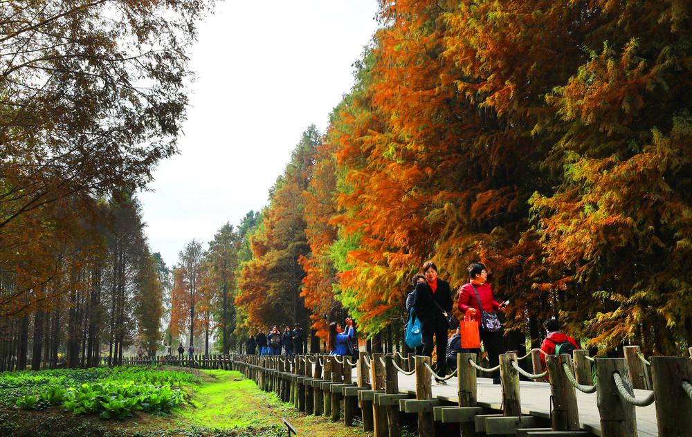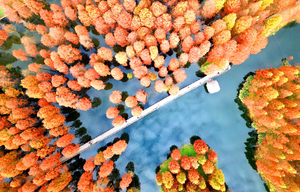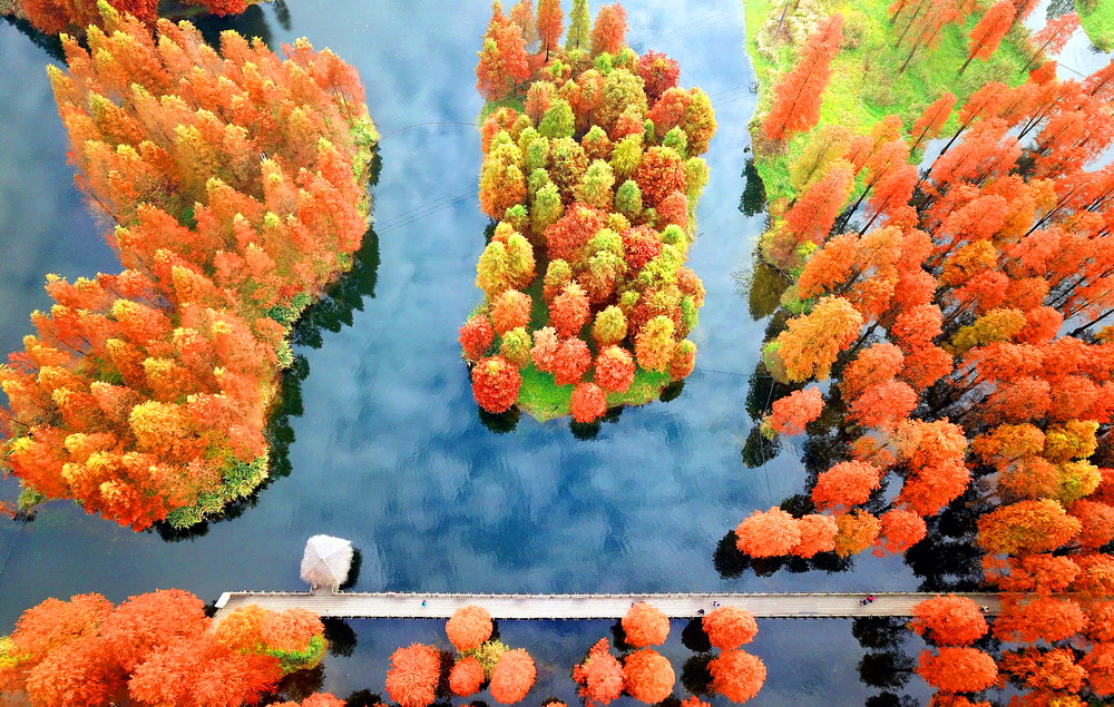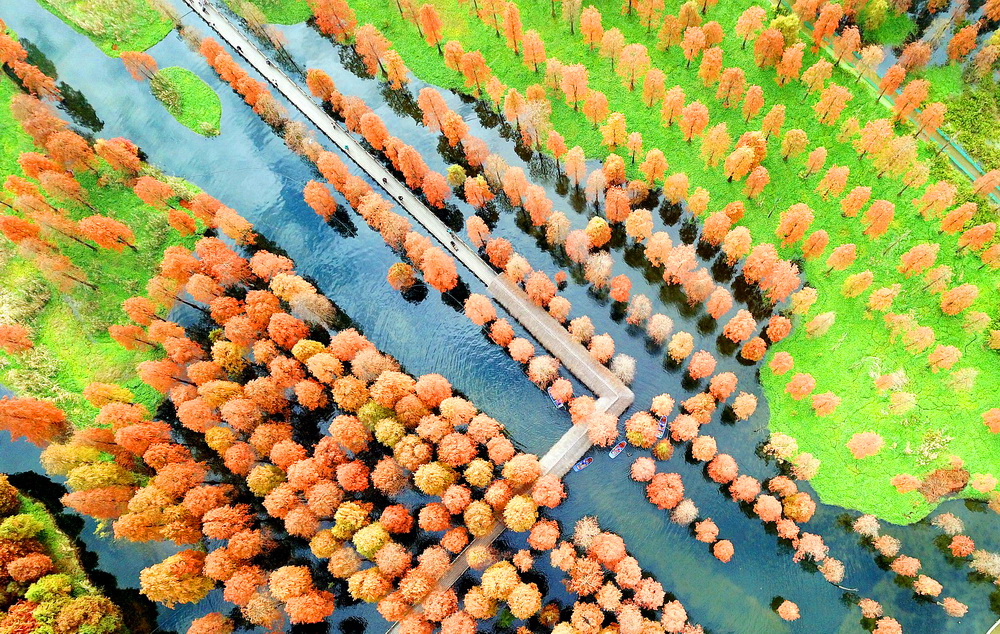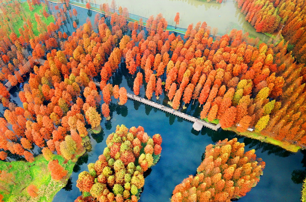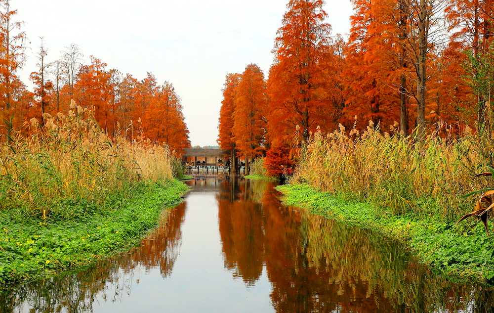 水杉橙红,湖面静蓝,上海这公园成了油画
