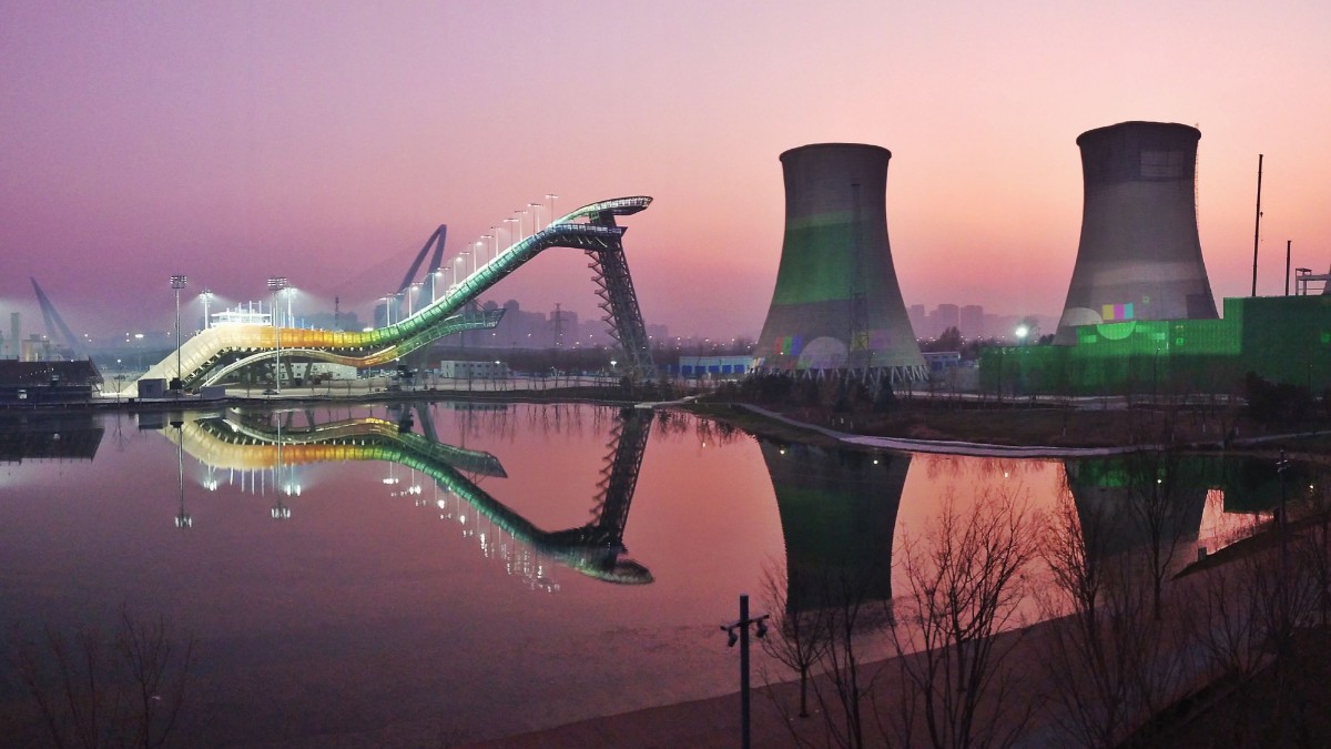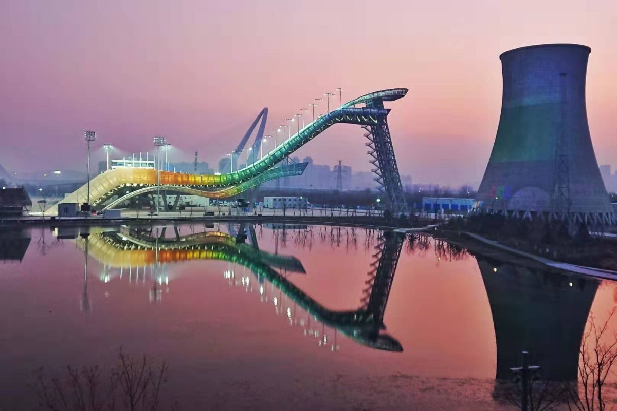 在首钢园北区,路过群明湖的人们总会禁不住驻足观望,将目光投向园内的“明星”项目——首钢滑雪大跳台。大跳台周边处处是景,“群星”环绕:东有群明湖,西临永定河,南靠新首钢大桥,北贴四座冷却塔工业遗存和老电厂。