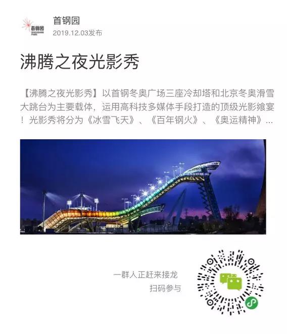 12月12日至14日每天比赛期间,首钢滑雪大跳台将举办3场灯光秀表演,营造夜间美轮美奂的体视觉效果。13日晚7时40分,首钢园区还将向市民游客开放,提前报名的观众能来到园区亲眼欣赏这场灯光秀。