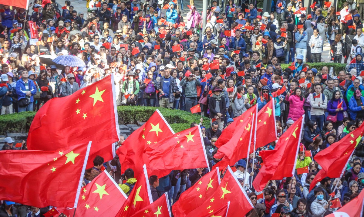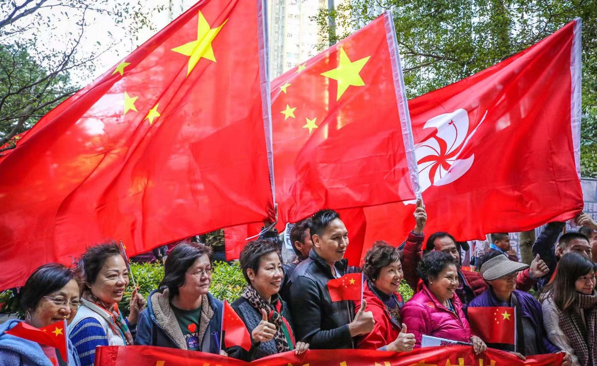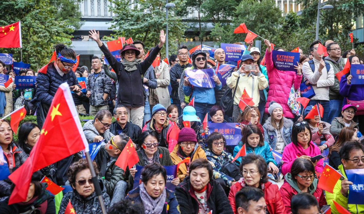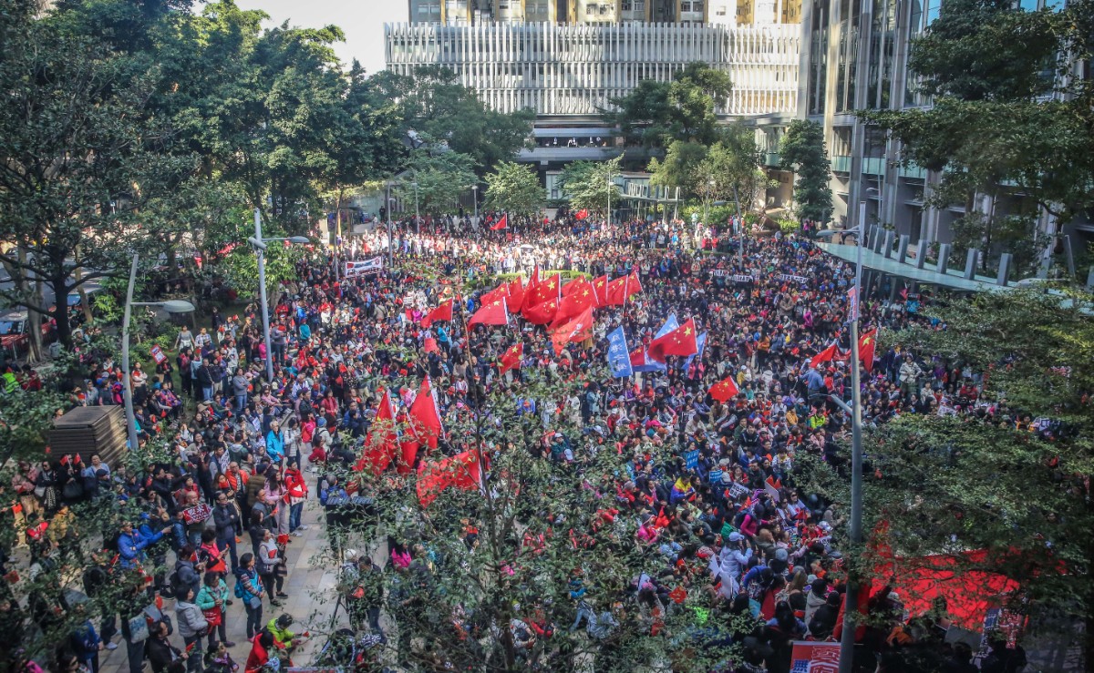 12月7日, 香港湾仔港湾道花园人头攒动,五星红旗映出一片“红色的海洋”。3000余名市民齐聚于此参加爱国护港反暴力集会,表达止暴制乱、守护香港的共同心声。