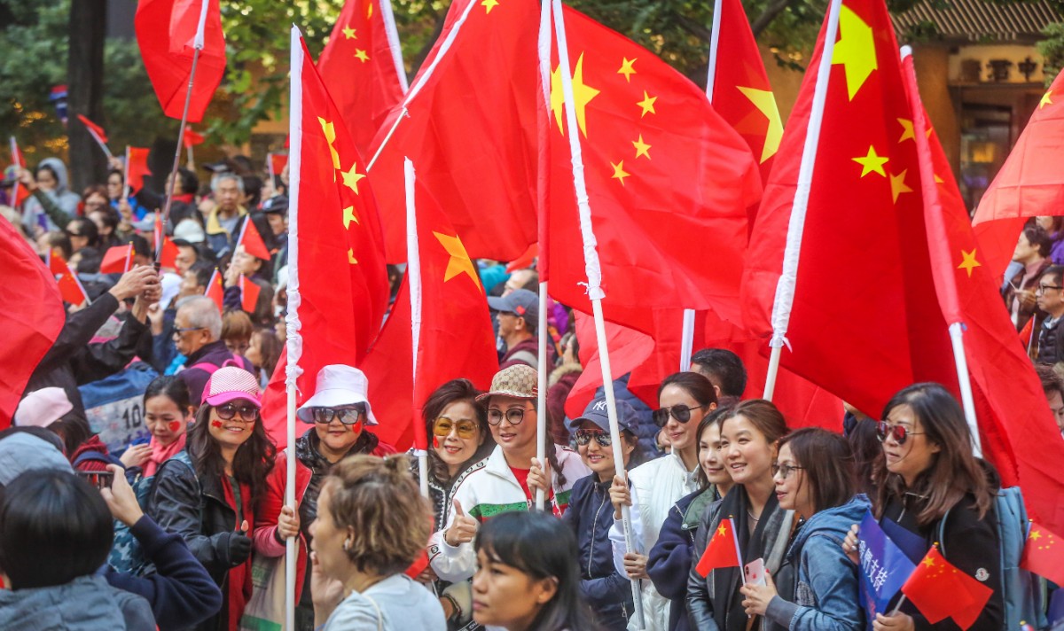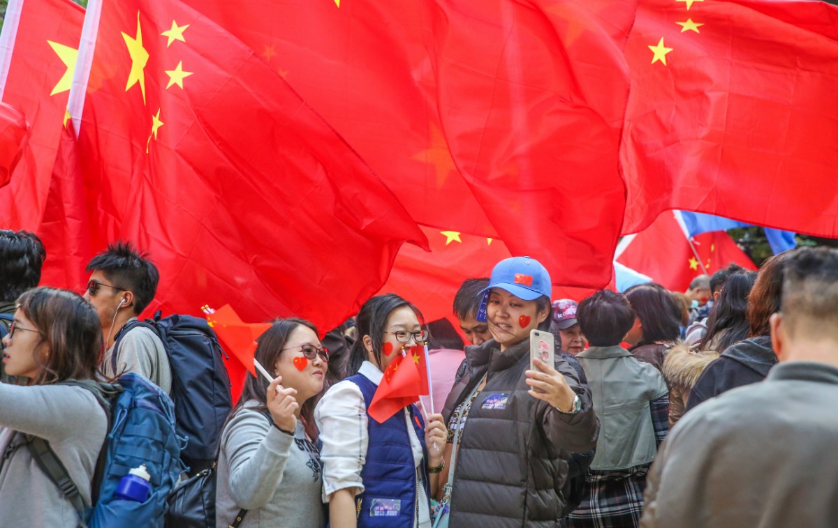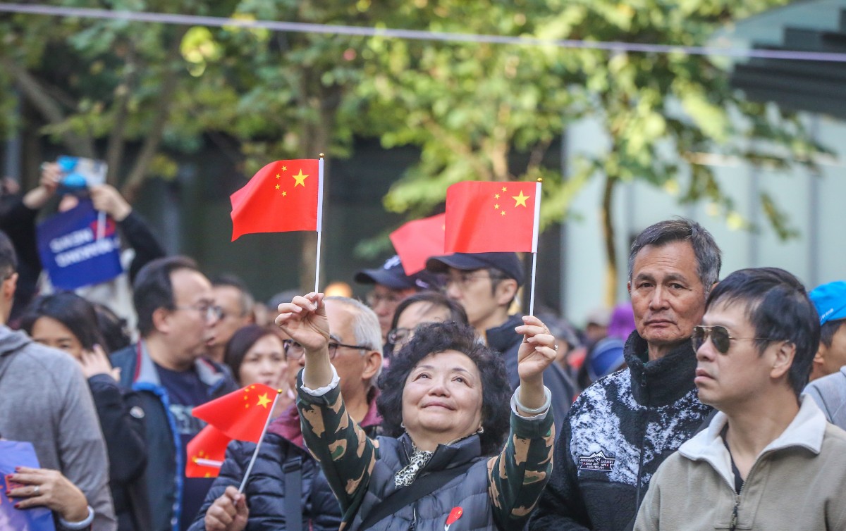 随着庄严的国歌奏响,市民们挥舞着手中的五星红旗齐声合唱,还有市民将印有国旗图案的贴纸贴在脸上。