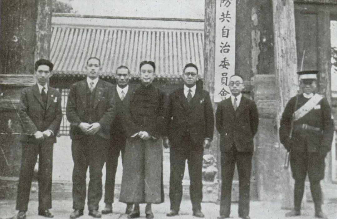 1935年12月由汉奸殷汝耕等人成立的“冀东防共自治委员会”是日本扶持成立的傀儡政权之一。图为汉奸们在委员会衙门门前合影。