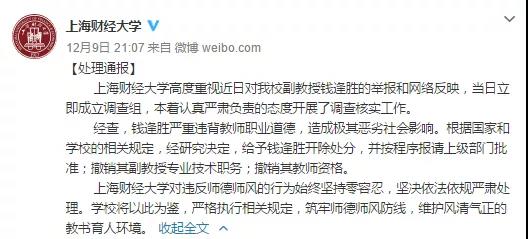 12月9日,上海财经大学发布对副教授钱逢胜的处理通报。