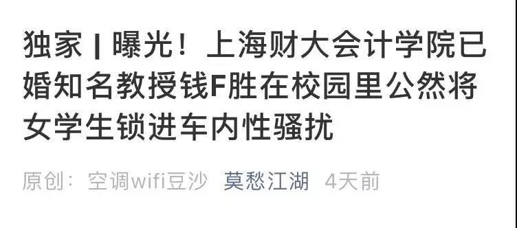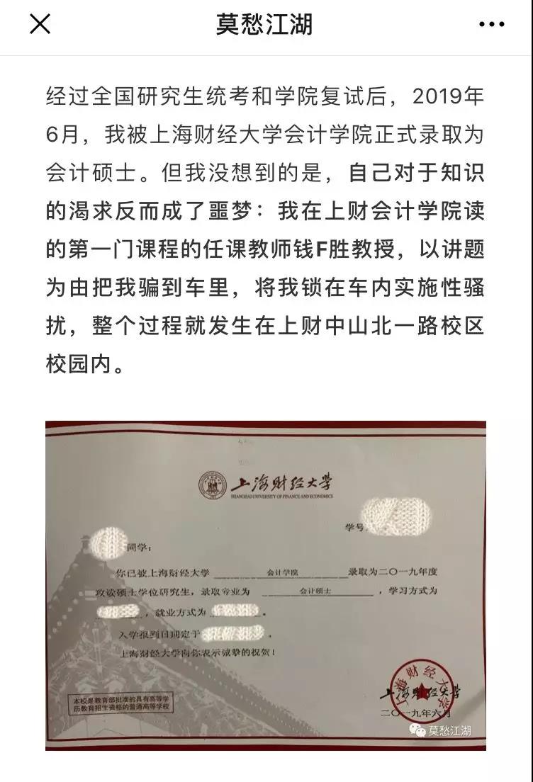 近日,一篇爆料“上财知名教授在校园内公开骚扰女学生”的文章引发网友关注。文章作者自称是上财会计学院的一名硕士研究生,曾多次遭到钱逢胜老师的骚扰。