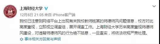 12月6日晚9时,上海财经大学发布情况通报,称已注意到网络平台上出现有关我校教师钱某的师德师风问题信息,校方对此高度重视,立即成立调查组,展开调查工作。