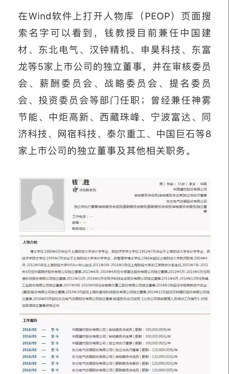 钱教授目前兼任中国建材、东北电气、汉钟精机、申昊科技、东富龙等5家上市公司的独立董事,并在审核委员会、薪酬委员会、战略委员会、提名委员会、投资委员会等部门任职;
