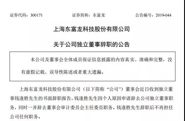 12月8日,上海东富龙科技股份有限公司、上海汉钟精机股份有限公司先后发布公告,称“公司独立董事钱逢胜因个人原因申请辞去公司独立董事职务,同时一并辞去董事会审计委员会主任委员职务。钱逢胜辞职后不再担任公司任何职务”。