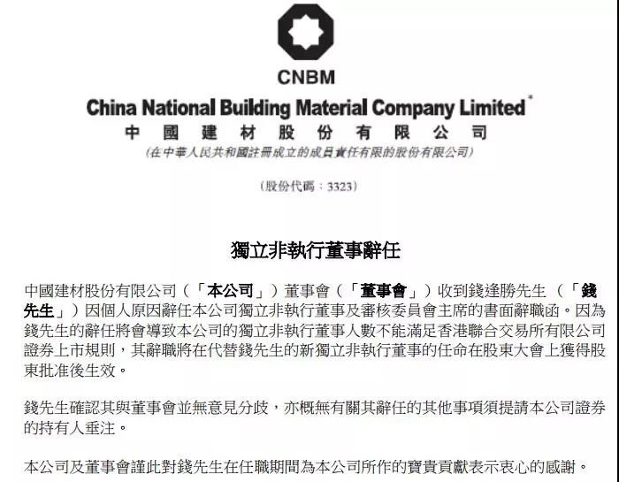 9日,中国建材股份有限公司发布公告,称收到钱逢胜的书面辞职函。