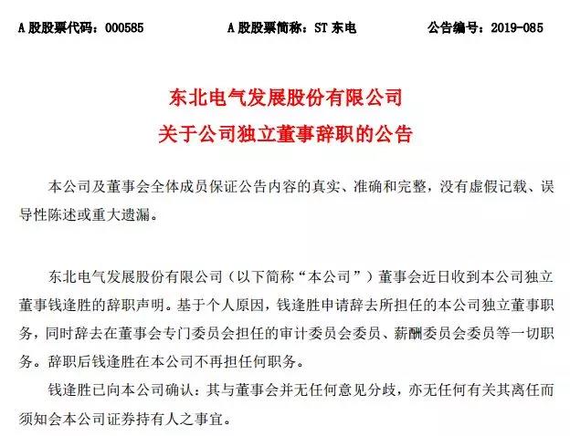 随后,东北电气发展股份有限公司发布公告,称基于个人原因,钱逢胜申请辞去所担任的本公司独立董事职务,同时辞去在董事会专门委员会担任的审计委员会委员、薪酬委员会委员等一切职务。