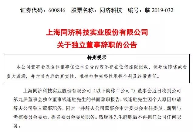 10日,同济科技也发布公告,称钱逢胜因个人原因申请辞去公司独立董事职务。